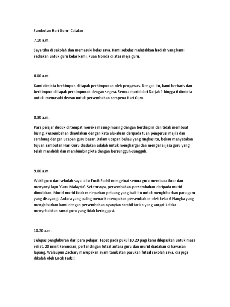 Sekolah saya telah mengadakan majlis sambutan Hari Guru di dewan sekolah. Contoh karangan spm kelas tambahan. Tulis catatan tentang sambutan Hari Guru tersebut.